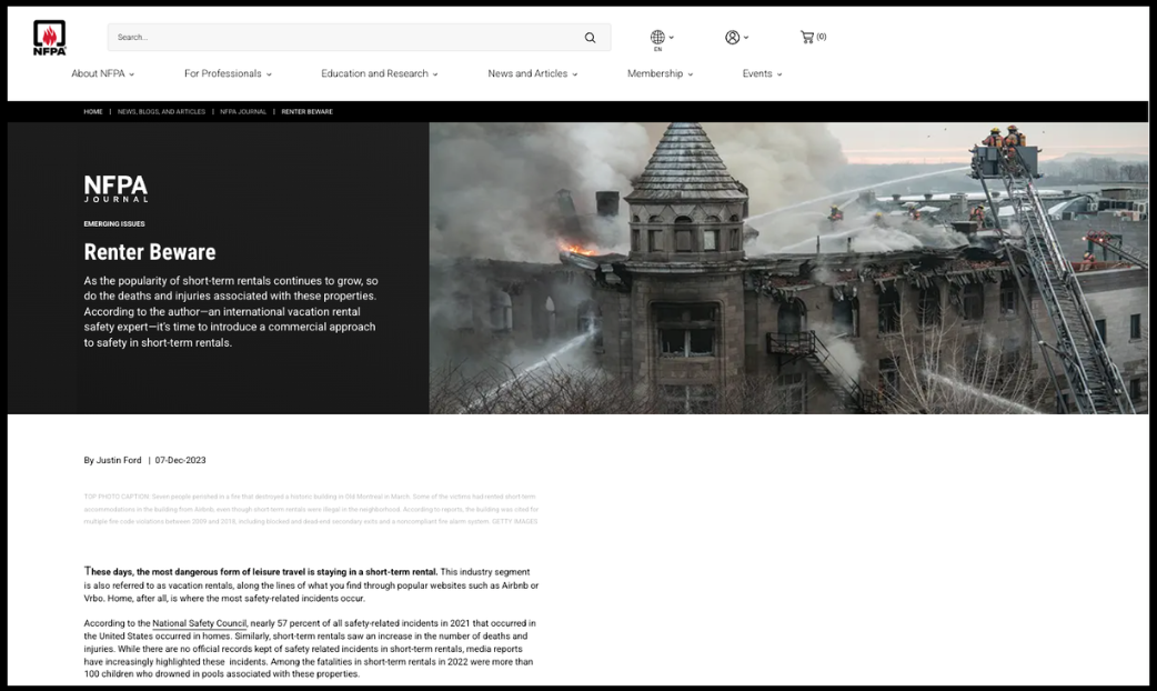 As he explained in his widely acclaimed NFPA Journal article Renter Beware (2023), the challenge is clear: short-term rentals operate differently than traditional housing, yet are often not held to consistent safety expectations. He emphasized that this sector is “the most dangerous in hospitality” and highlighted the urgent need for better safety awareness, inspections, and accountability across the industry.